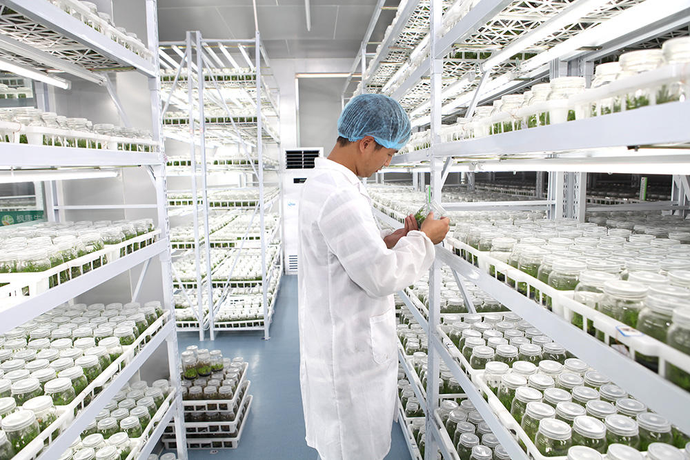 接种、育苗、研发一体化的组培中心,建筑面积4500余平方米,完全按照GMP标准化无菌设计建造,年组培能力在80万瓶左右,约3000万株;污染率控制在3%以下,幼苗成活率达到99%。成立了浙江大学与公司的铁皮石斛研发中心和科研实践基地,进行铁皮石斛栽培与化学成份分析研究,建立了本地化的铁皮石斛组织培养快速繁殖体系。