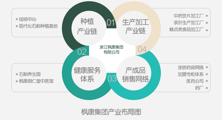 枫康集团作为中国石斛养生文化引领者以及铁皮石斛行业领导品牌,始终坚持高品质,从源头到终端消费者的每一个环节,层层把关。企业始终精准把握时代脉搏,创新发展,以象山生态型种植养生基地为依托,开发生态高效农业、文化旅游产业、健康养生产业、全国连锁产业等朝阳产业,专业化的运作有效推动铁皮石斛从“研发—种植—加工—销售”全产业链的发展,实现集团在铁皮石斛种苗培育、种植加工、休闲旅游、零售连锁、养生保健、农业生物研究、科普教育等方向一体化发展,打造出一二三产深度融合、有机联动、协同发展的”三产联动“特色养生体系,逐步塑造大健康、大养生品牌,并形成产业链完整、多元化拓宽,规模化推进、高质量发展的新格局,为实现石斛全产业链腾飞和整体商业闭环打下了坚实的基础。